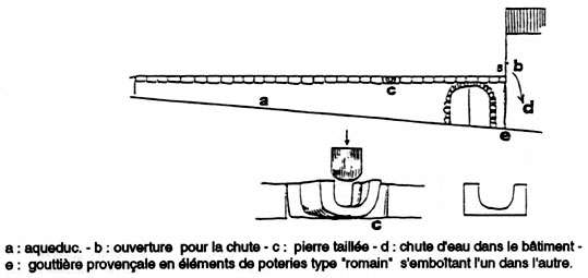| Ce moulin à recence situé presque en plaine est le dernier de la chaîne du canal des moulins. Il fut transformé un temps en en cave à vin. Il est précédé d'un bel aqueduc de 28 mètres de long sans arcades, avec le canal au sommet construit en pierres taillées. | |
